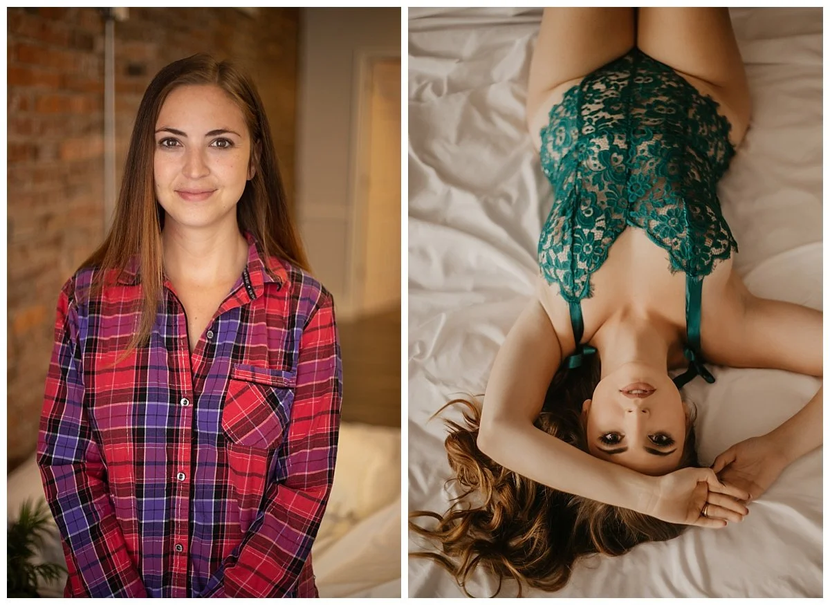 When Jessie showed up to the studio in a flannel shirt I knew we’d be friends! We talked about rescuing dogs and how we got our own fur babies. She was so sweet and ready for any direction I gave her. Her hair and makeup was absolutely flawless and done by none other than Cammie Carter. She used a teal bodysuit from my client closet that made her skin glow! She also brought a white bodysuit with a sexy lace up design in the front. We ended her session with my fav, the classic white sheet and it was SOOO SEXY!
